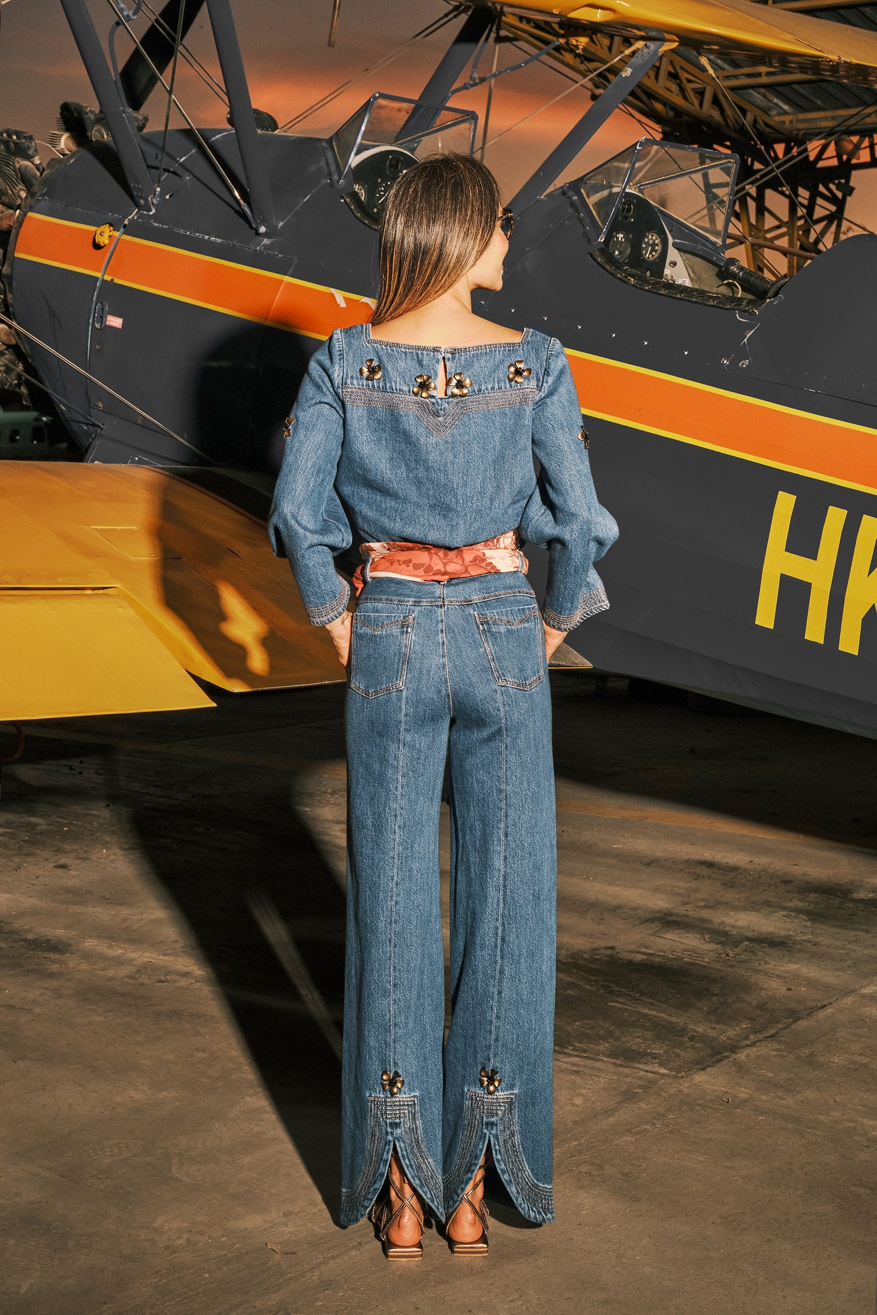 Blusa confeccionada en denim suave, diseñada con elegantes mangas campana sujetas de forma fija en los puños para aportar estructura y estilo. Destaca por sus pespuntes en contraste, que realzan el diseño, y un delicado bordado manual con pedrería que aporta un toque artesanal y femenino.