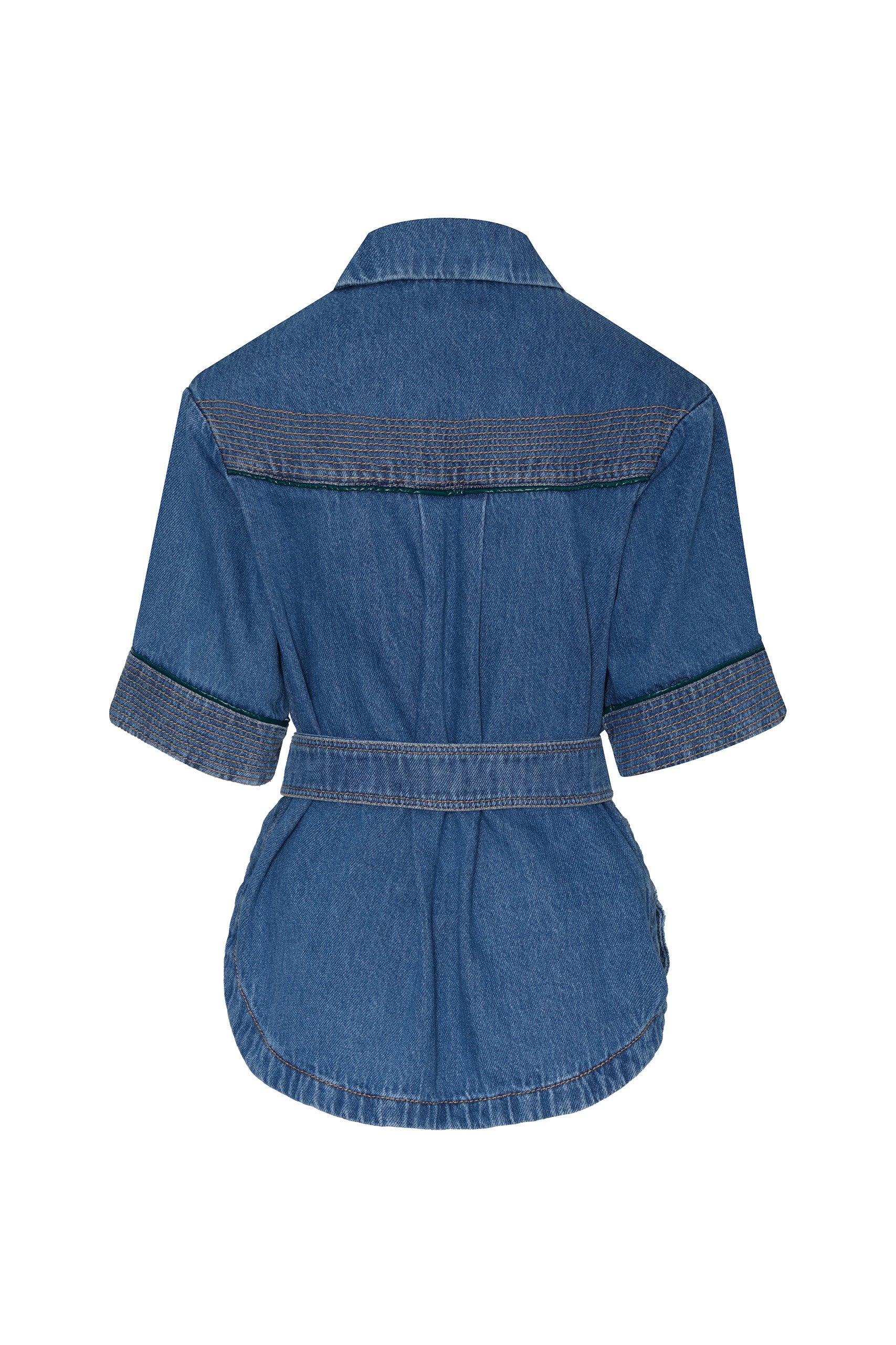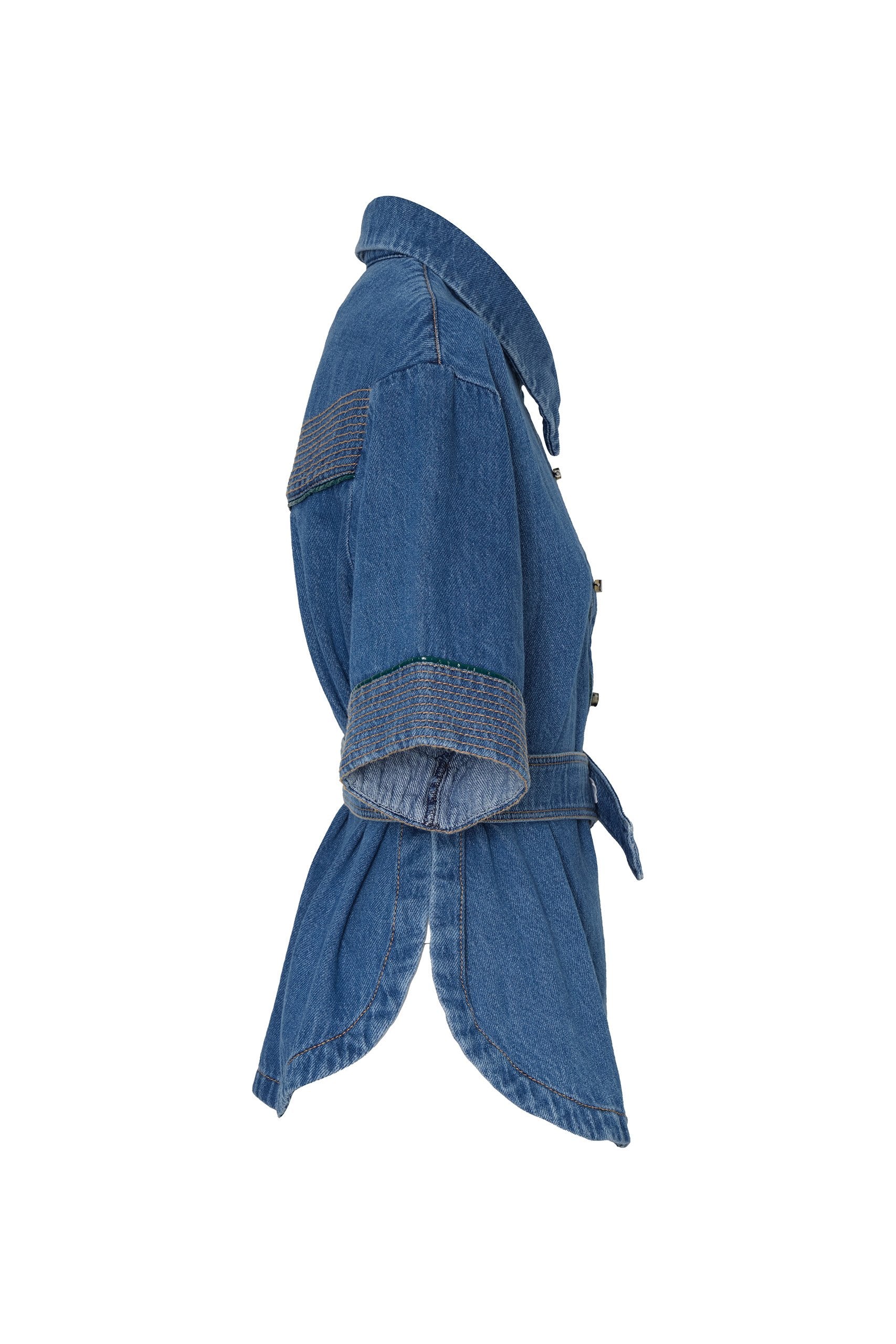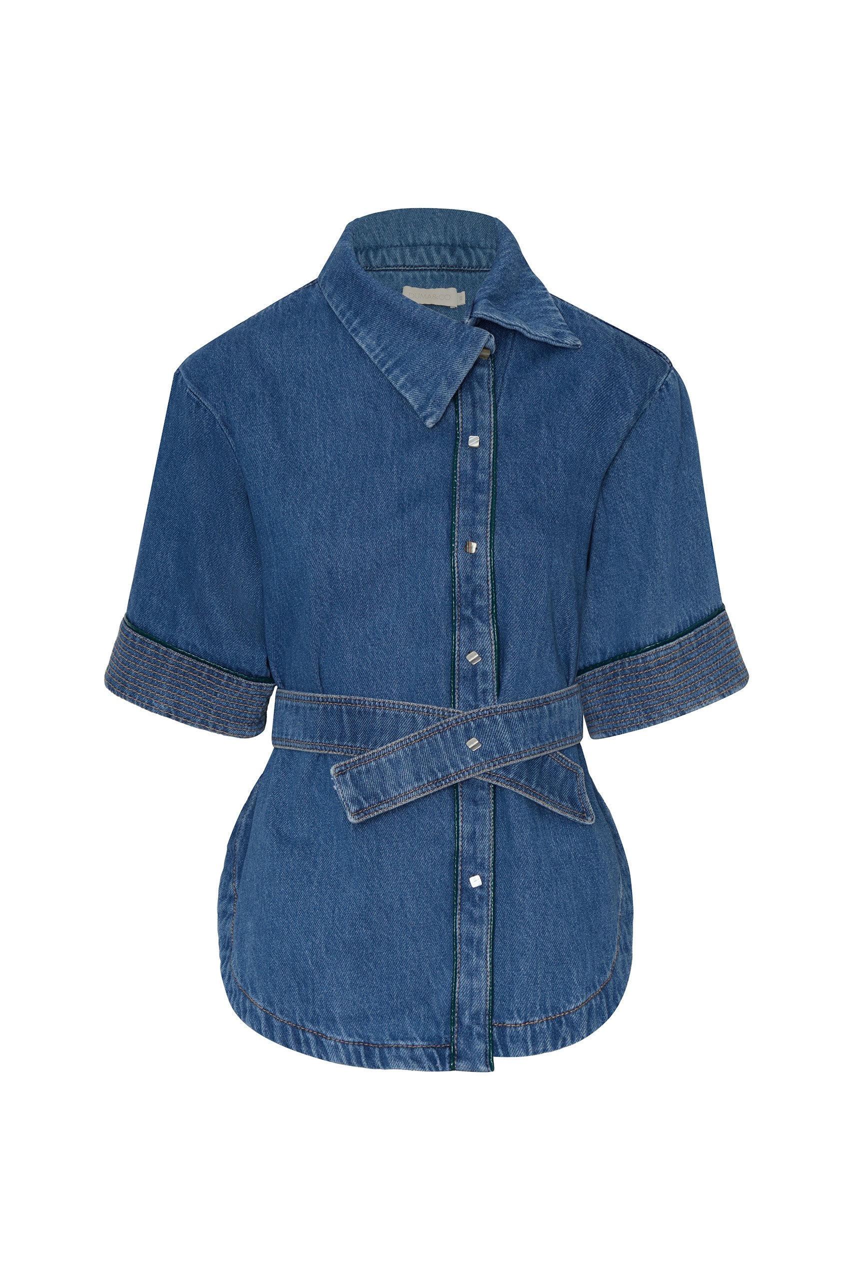 Camisa confeccionada en denim, con un diseño moderno y estructurado. Presenta solapa de cuello y cartera de botonadura asimétricas. Destaca por su vivo en vinilo a contraste de color, ubicado estratégicamente en la cartera, los puños de las mangas y la almilla posterior, elevando visualmente la prenda. Lleva pespuntes a contraste que sobresalen y remarcan las líneas del diseño, junto con botones en contraste de color que refuerzan su carácter. Se complementa con un cinturón a juego, ideal para ajustar la silueta y añadir versatilidad al look.