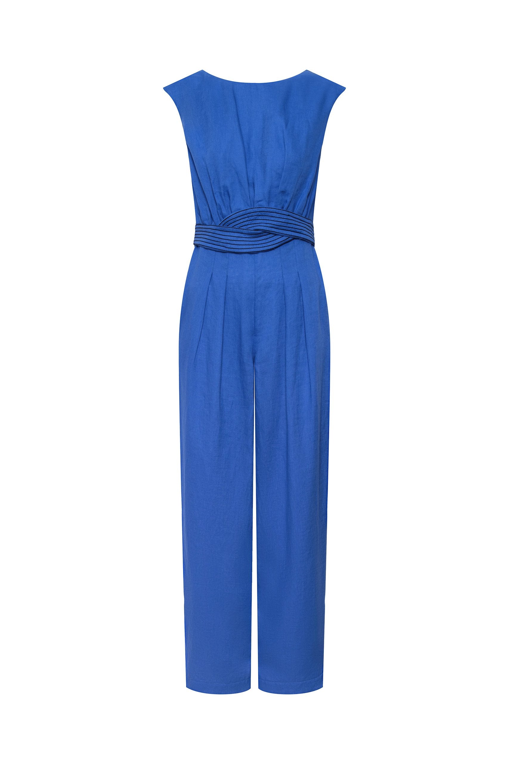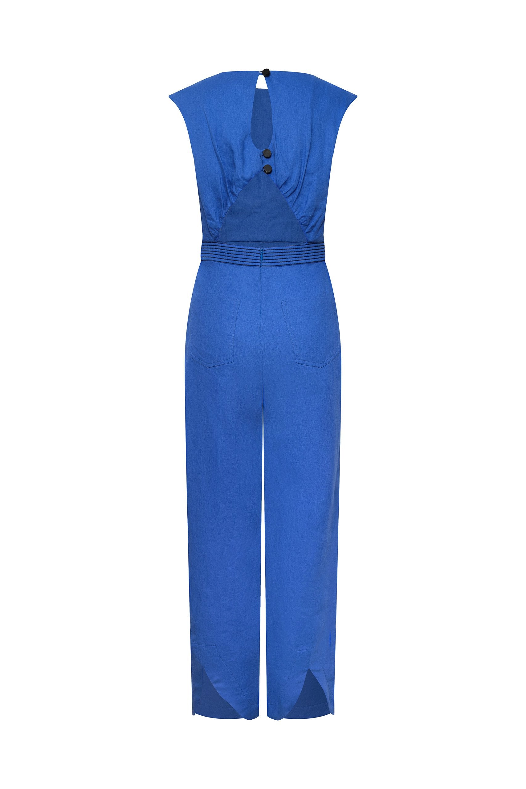Enterizo de silueta estilizada, con prenses en la cintura. En el delantero, incorpora una pretina sobrepuesta con forma ondulada, decorada con pespuntes a contraste de color que destacan y le dan carácter al diseño. La espalda presenta un escote sutil, acompañado de botones decorativos a contraste y una cremallera funcional. Incluye bolsillos laterales y posteriores, que combinan funcionalidad y diseño. Un corte transversal recorre desde el costado de la cintura hasta el centro posterior de la bota, añadiendo un detalle visual dinámico. Una prenda contemporánea y versátil.