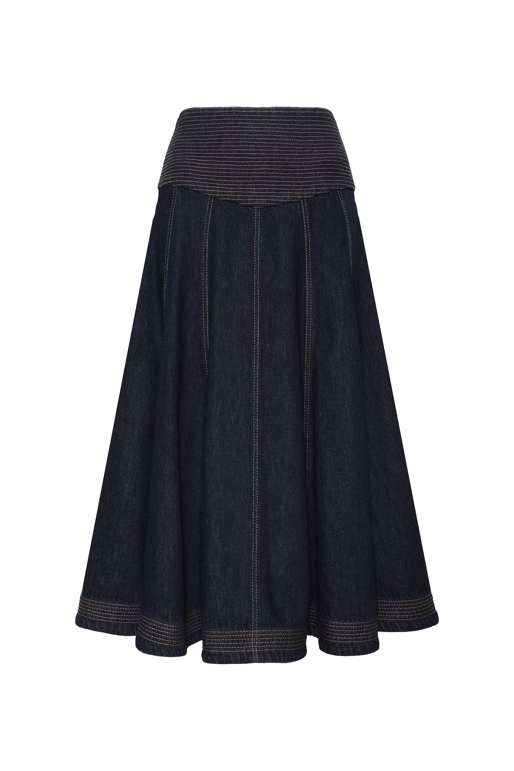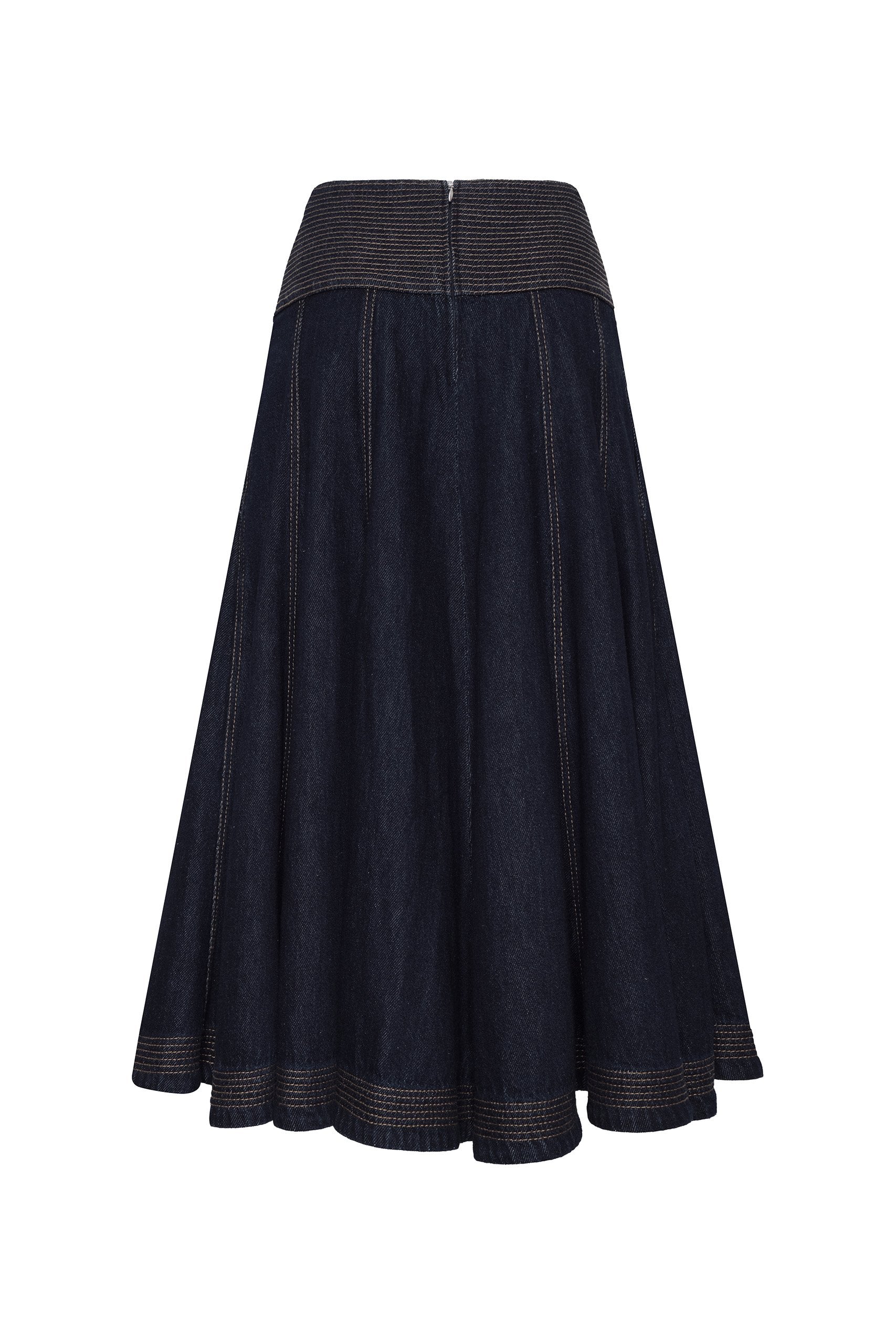 Falda confeccionada en denim, con una pretina ancha en forma de V que acentúa la cintura y estiliza la figura. Los pespuntes en contraste recorren la pretina y el dobladillo, aportando un acabado artesanal y llamativo. Su diseño incluye cortes estratégicos que le dan movimiento y un sutil vuelo, creando una silueta femenina y dinámica. Cuenta con bolsillos laterales funcionales, cremallera en el centro posterior y un largo midi perfecto para un look casual y sofisticado.