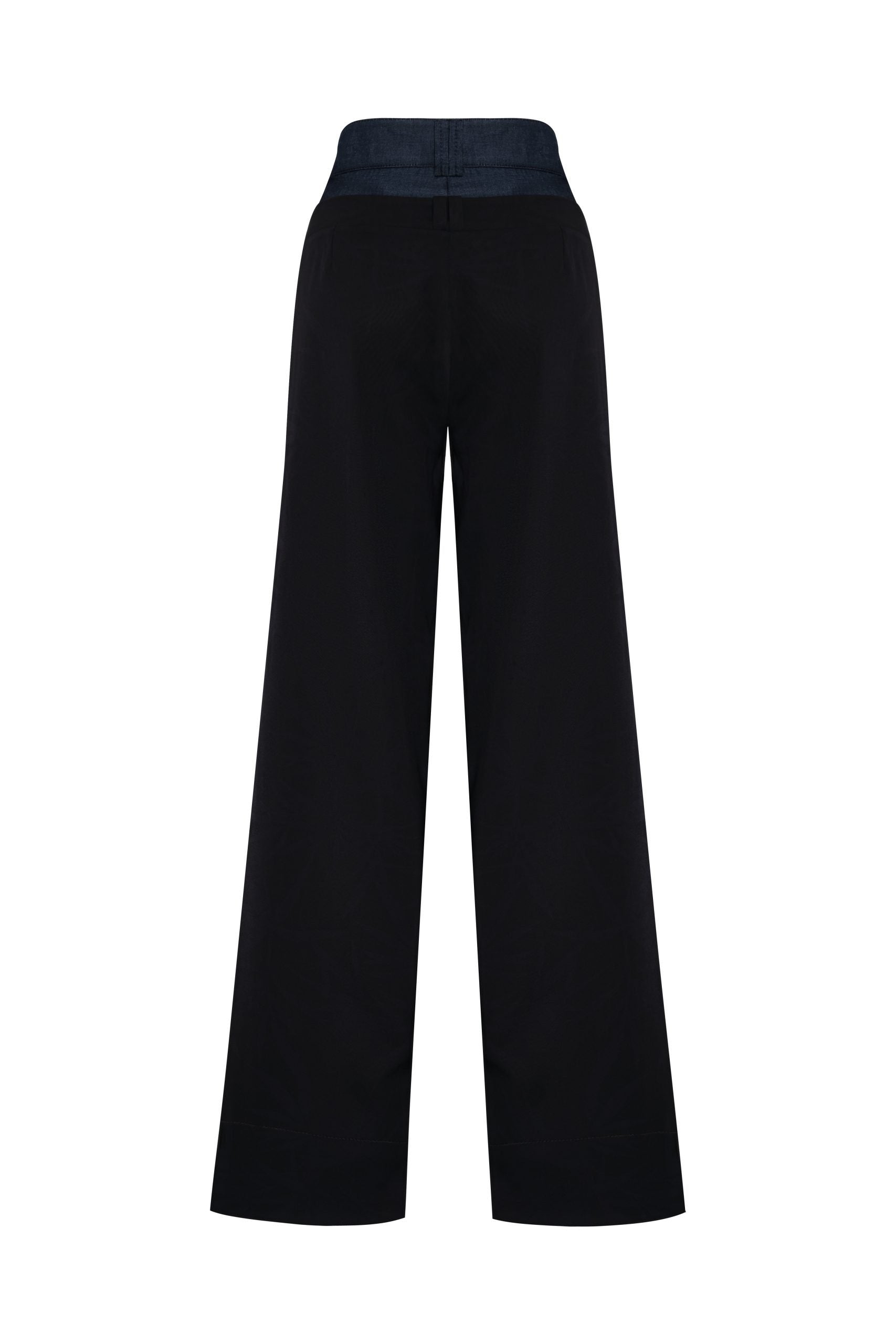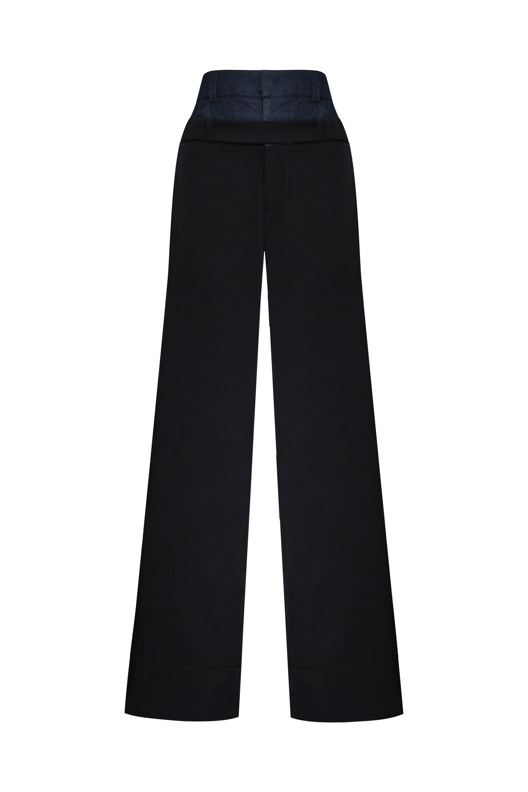 Pantalón de tiro alto y bota recta con contraste de color y textura, con corte en pretina.