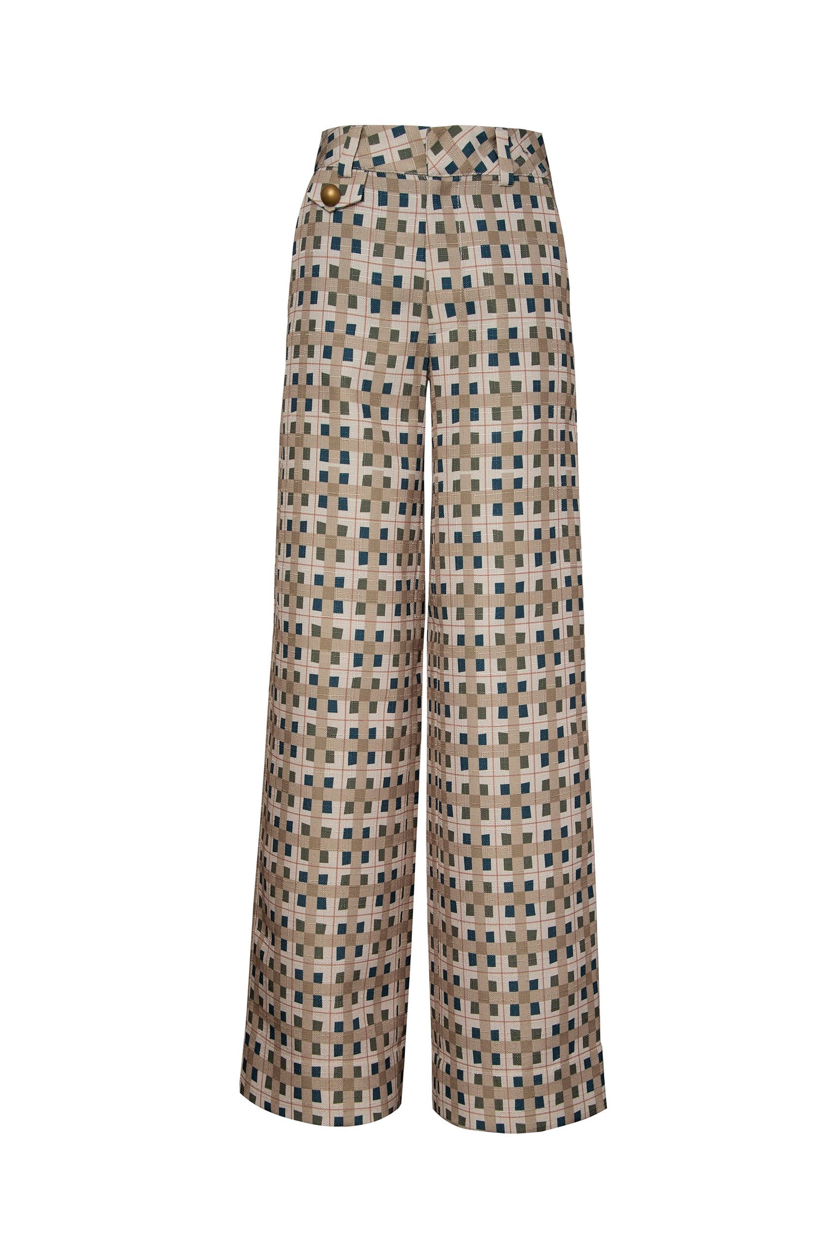 Pantalón estilo sastre de silueta recta y largo completo. Presenta bolsillos laterales funcionales y bolsillos ribetes en la parte posterior que acentúan su acabado pulido. La pretina incluye un gafete metálico que permite un ajuste seguro y discreto.