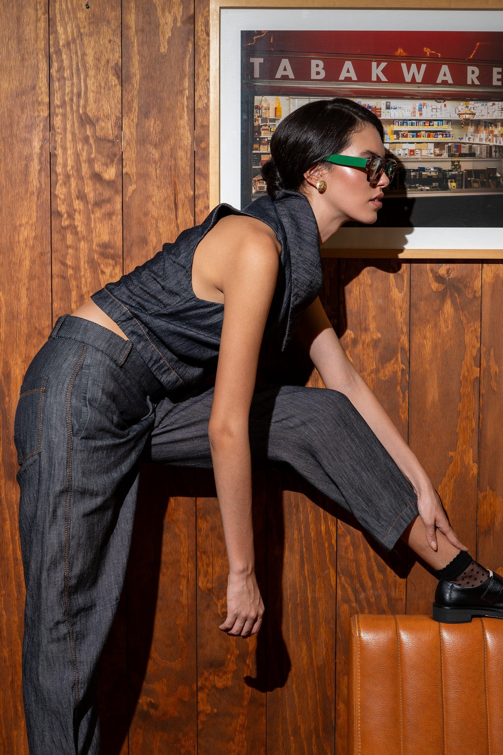 222Top con cartera y cuello asimétrico, botonadura oculta, manga sisa, con pespuntes de hilo a contraste y largo a la cintura. Su diseño combina líneas modernas con detalles distintivos que realzan la silueta.