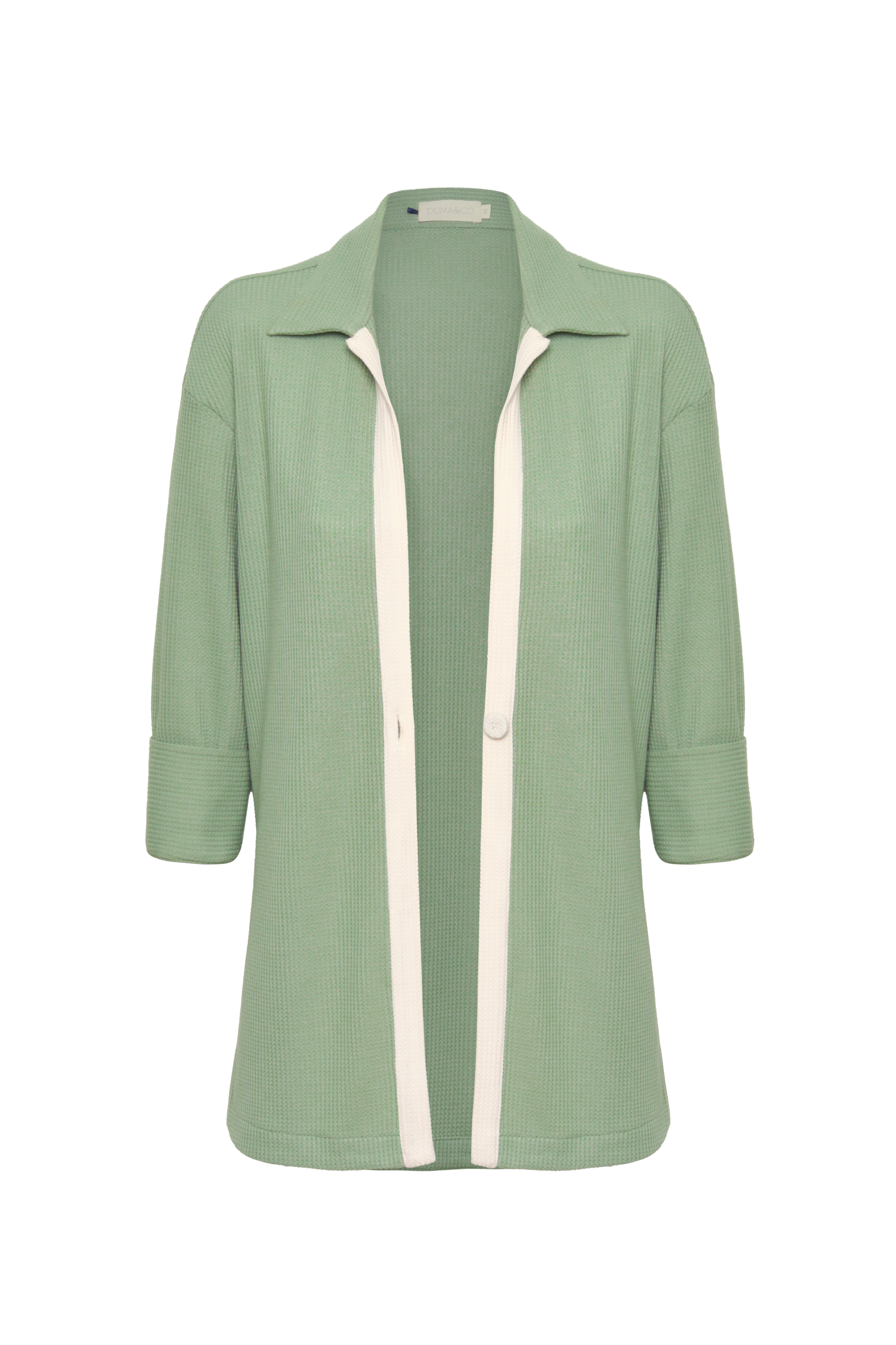 Kimono en tejido de punto texturizado. Cartera con botonadura a contraste y aberturas en costados.
