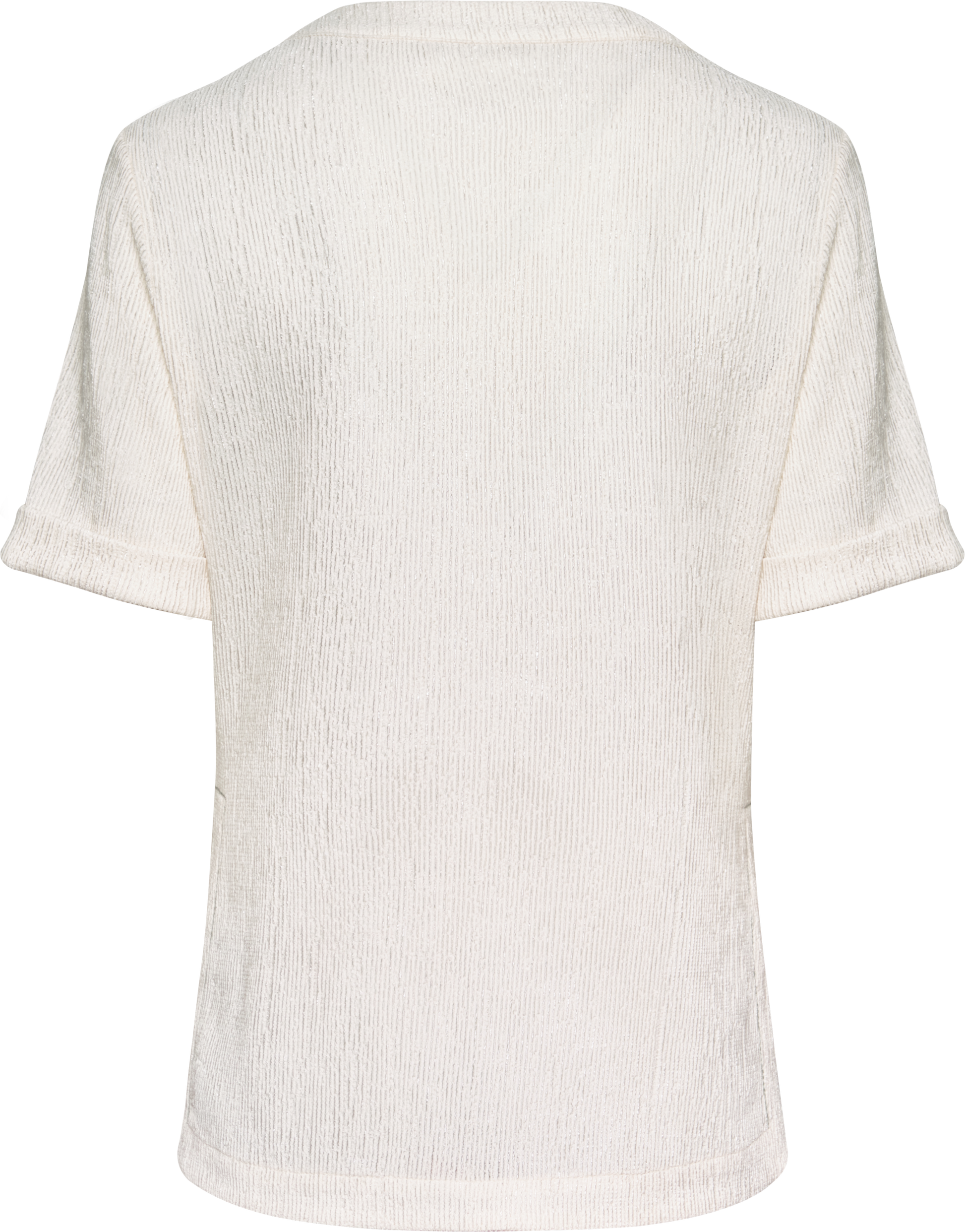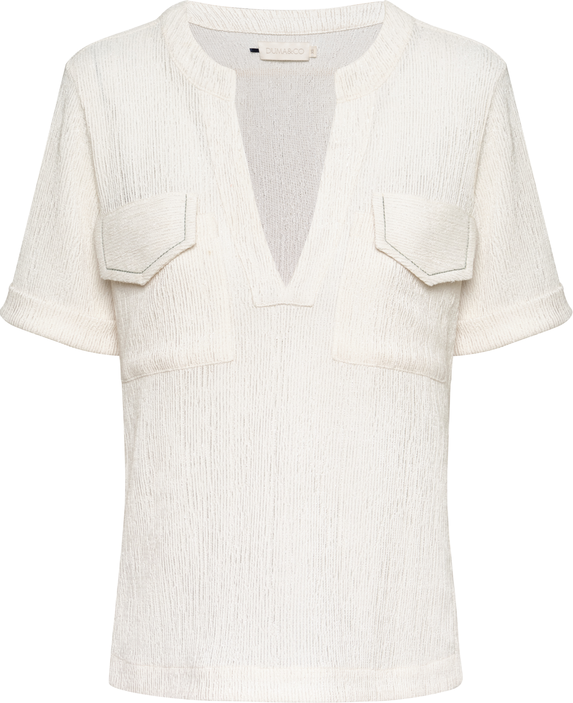 Blusa de manga corta en crepé texturizado, escote en V y bolsillos con solapa en delantero.