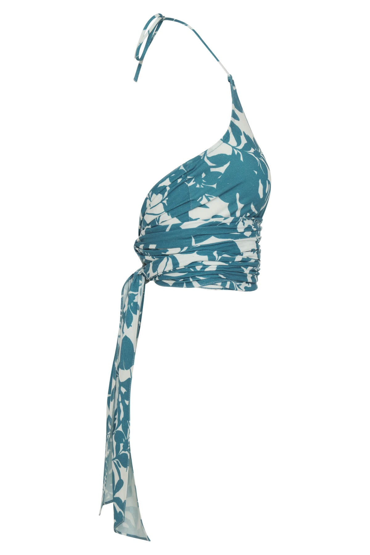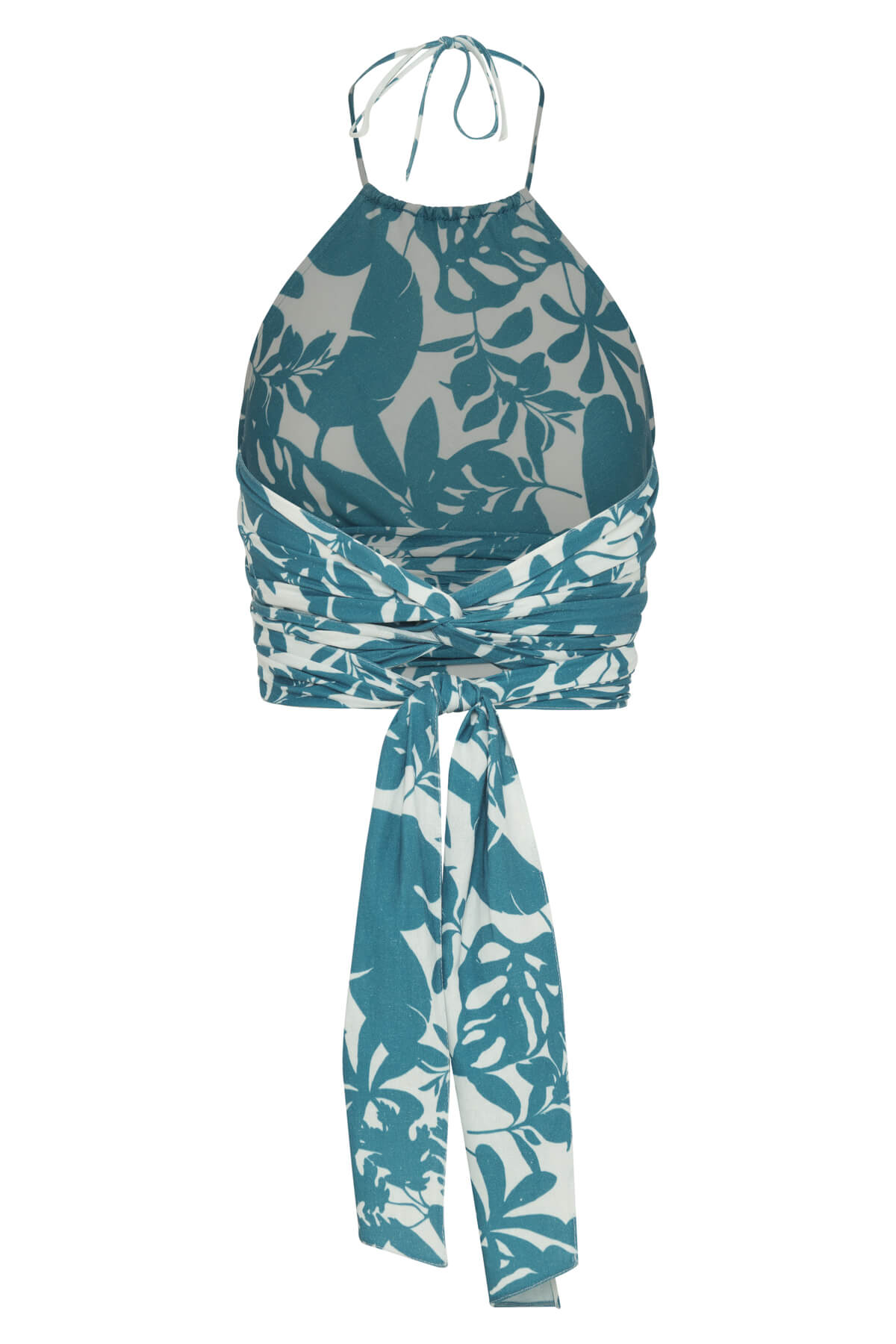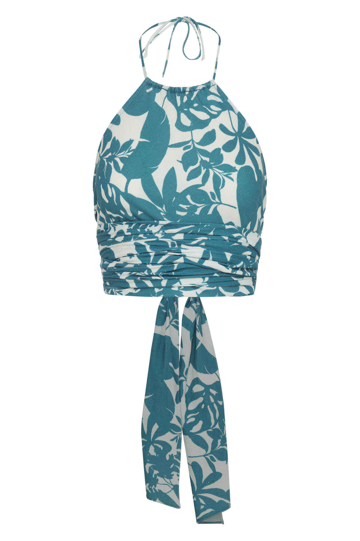 Top en lino con estampado exclusivo de la marca, con ajuste en el cuello y tiras de amarre en cintura que permiten anudar la prenda de diferentes formas.