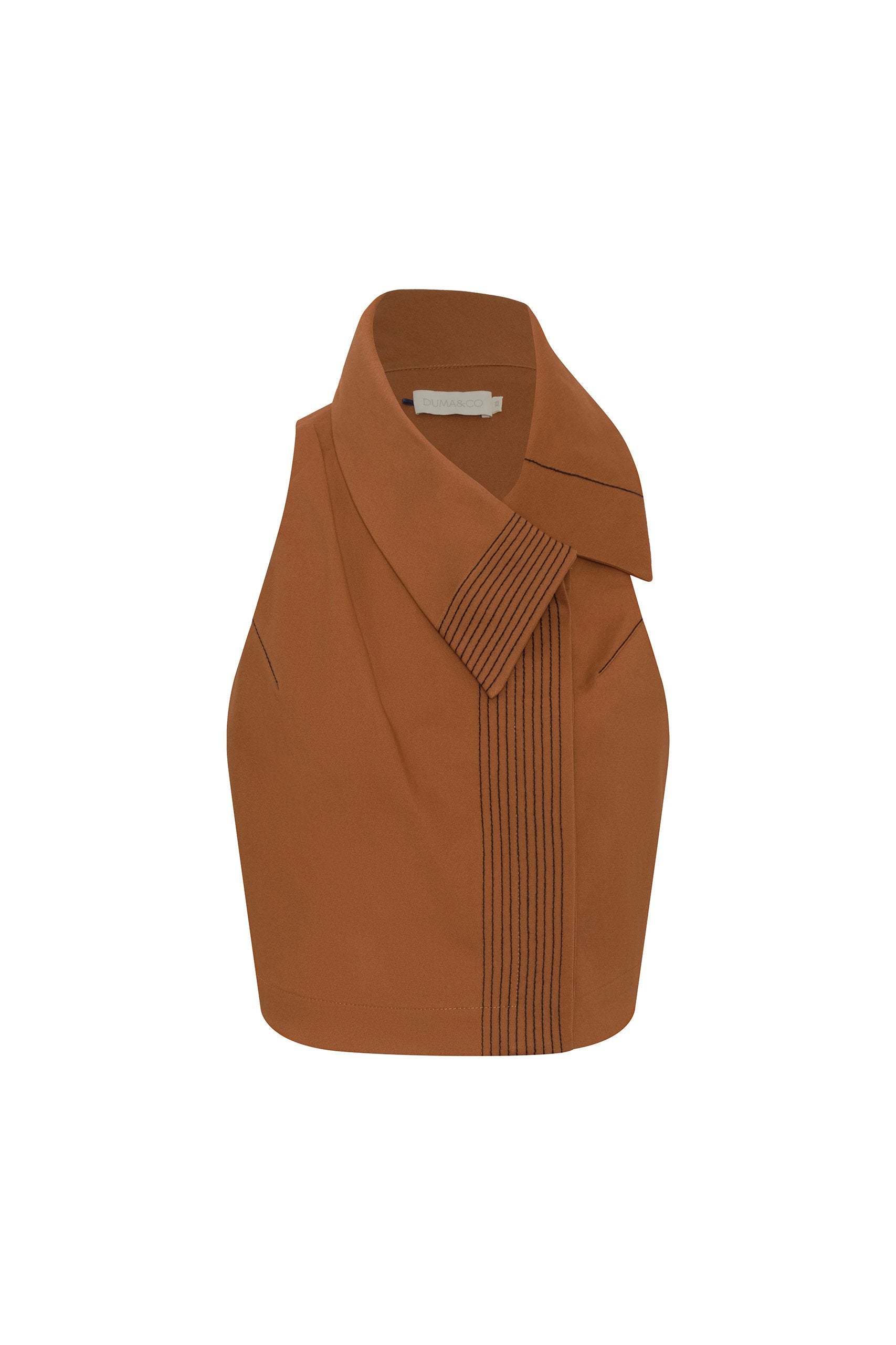Top de diseño moderno con cuello estructurado y cartera asimétrica, de largo a la cintura. Destacan sus pespuntes en contraste de color, ubicados estratégicamente en la solapa del cuello y en la cartera de la botonadura. La botonadura oculta incluye botones dorados funcionales, que permiten llevarlo abierto y usarlo como chaqueta corta, añadiendo versatilidad a la prenda. Una pieza contemporánea y adaptable, ideal para elevar looks con estilo y originalidad.