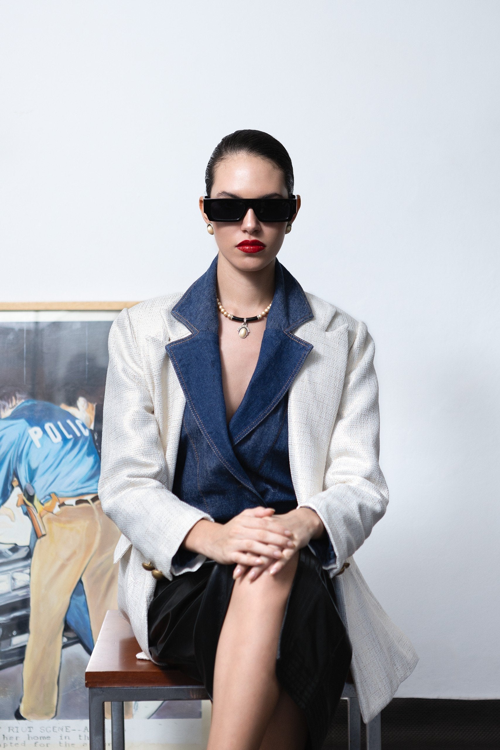Chaqueta de corte amplio y manga larga, con escote en V que le da un toque moderno. Lleva hilos en contraste que resaltan las costuras y un cinturón con pespuntes visibles que sobresale, marcando la cintura sin perder el estilo relajado.