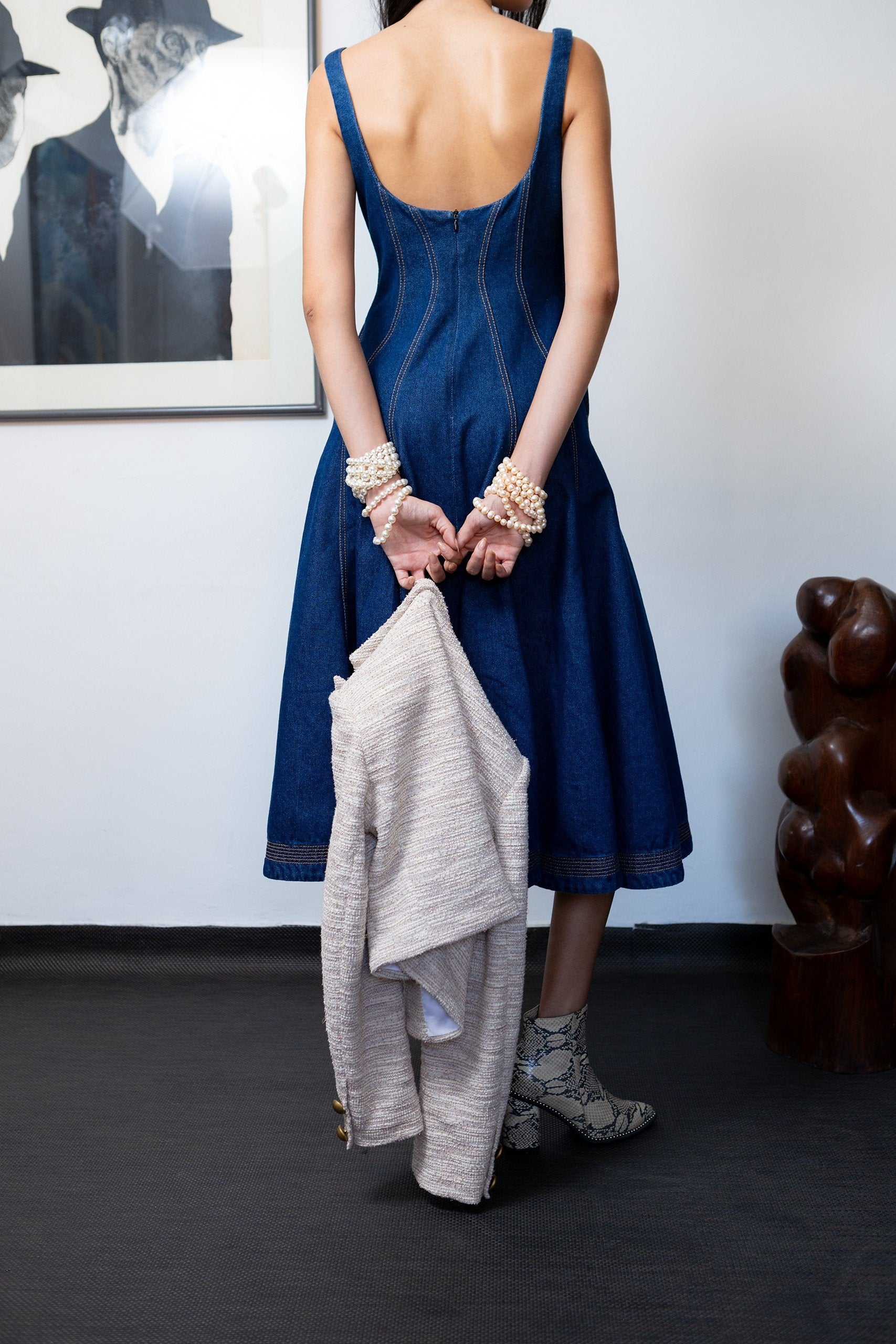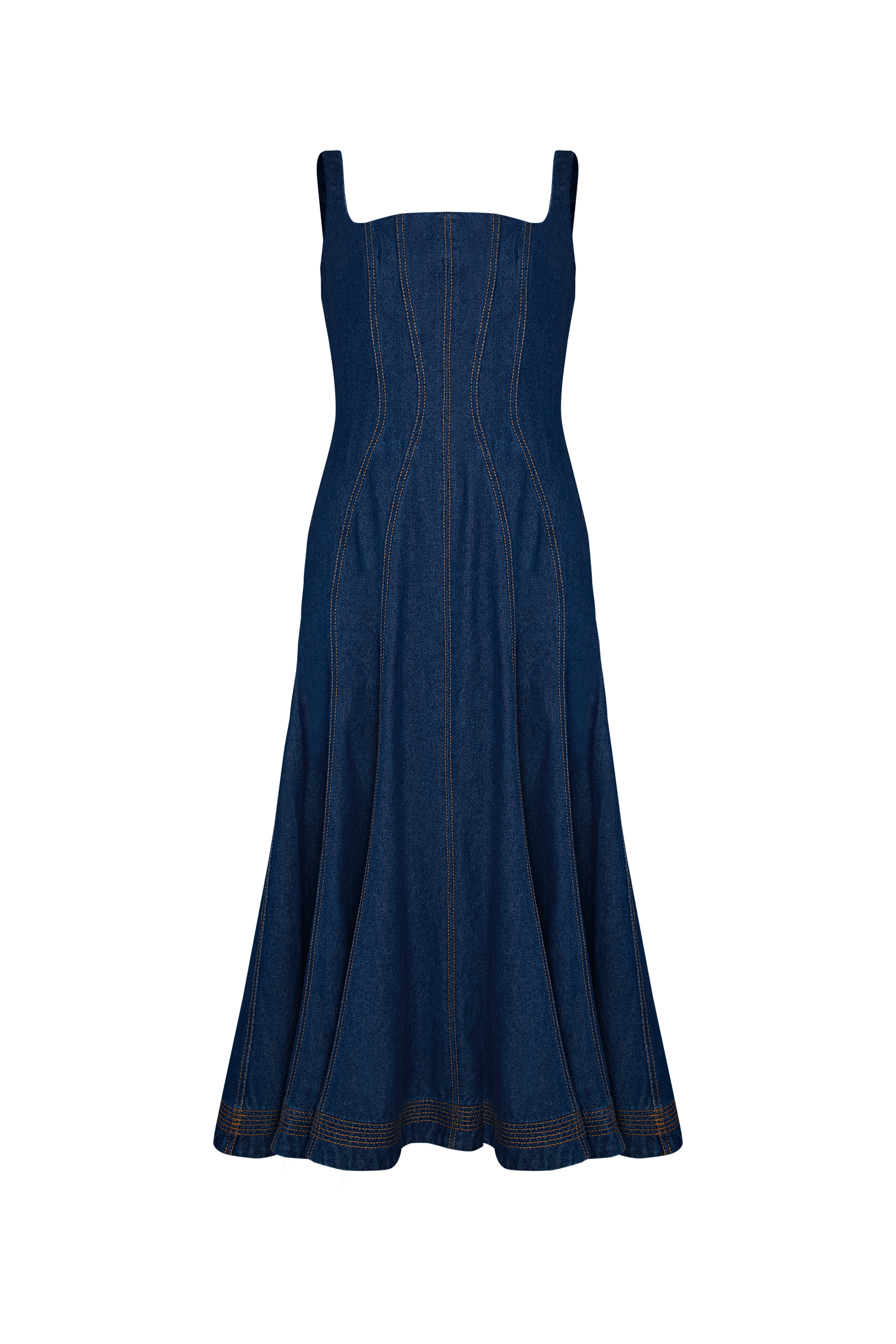 Vestido midi de silueta línea A, ceñido en la zona del busto para realzar la figura. Confeccionado con pespuntes en contraste de color que destacan los detalles del diseño y aportan un toque moderno. Incluye bolsillos funcionales en los costados, combinando estilo y practicidad.